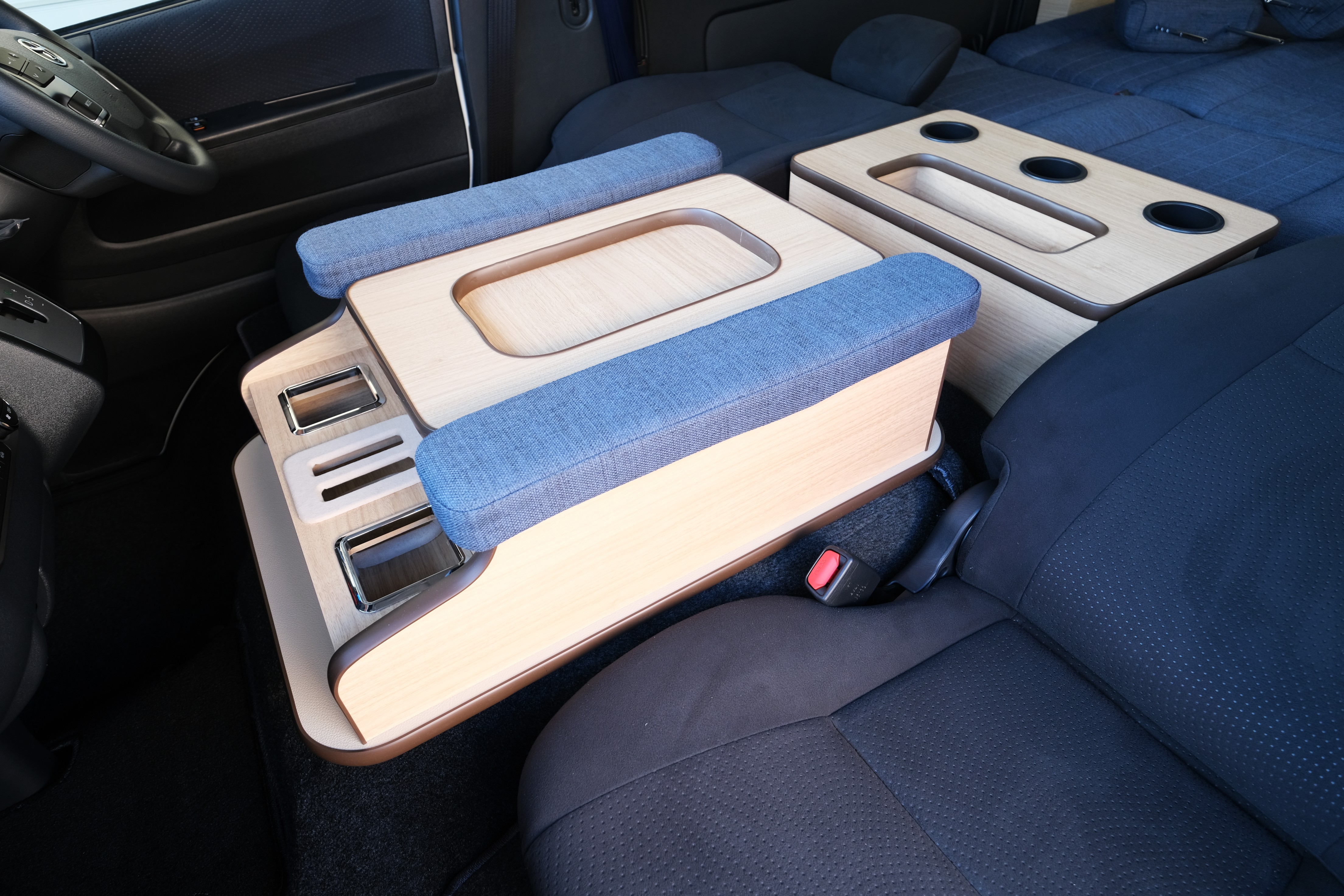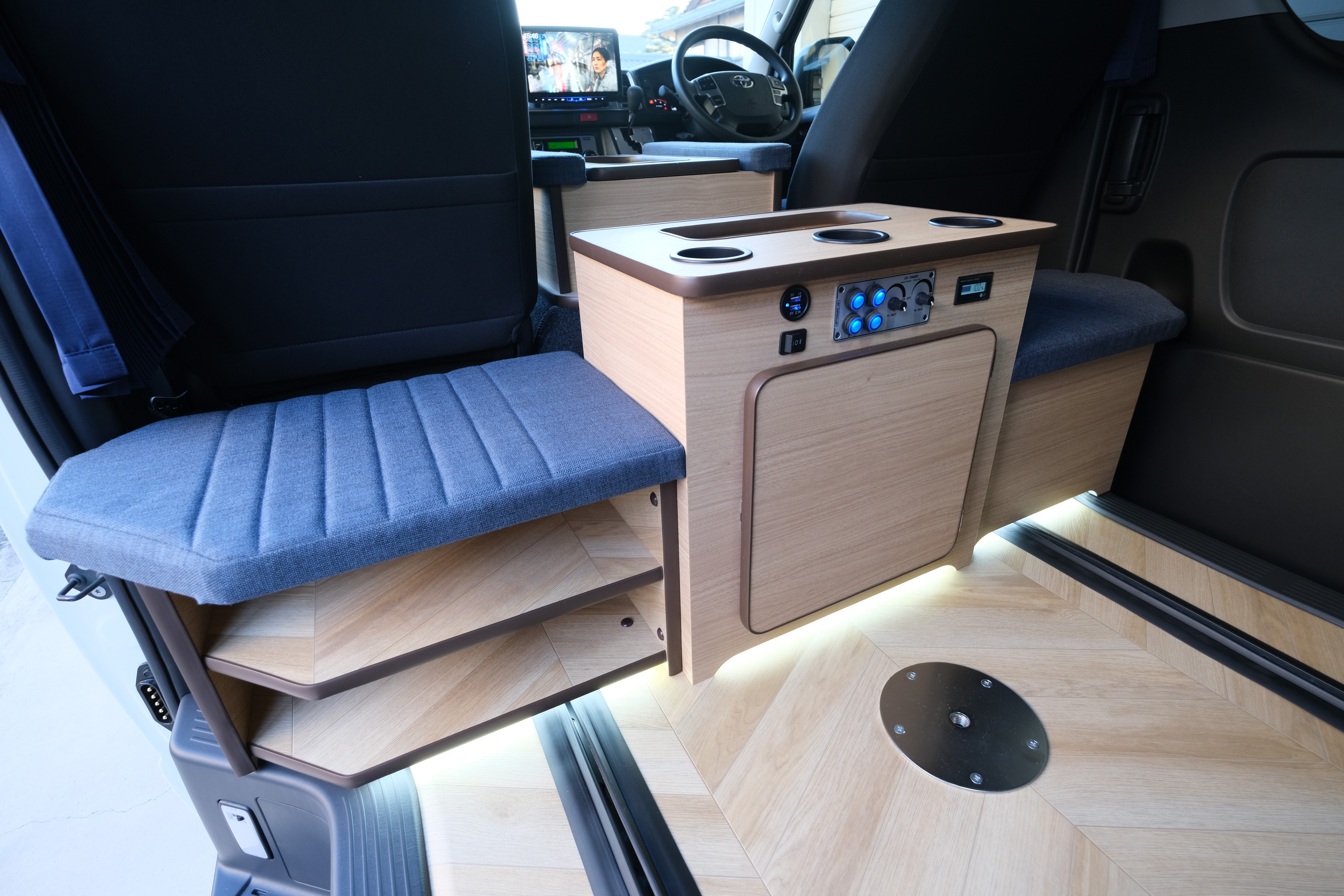 セカンドシートの前にはシューズトレイ・集中パネルスイッチ・サブバッテリー収納BOXを設置