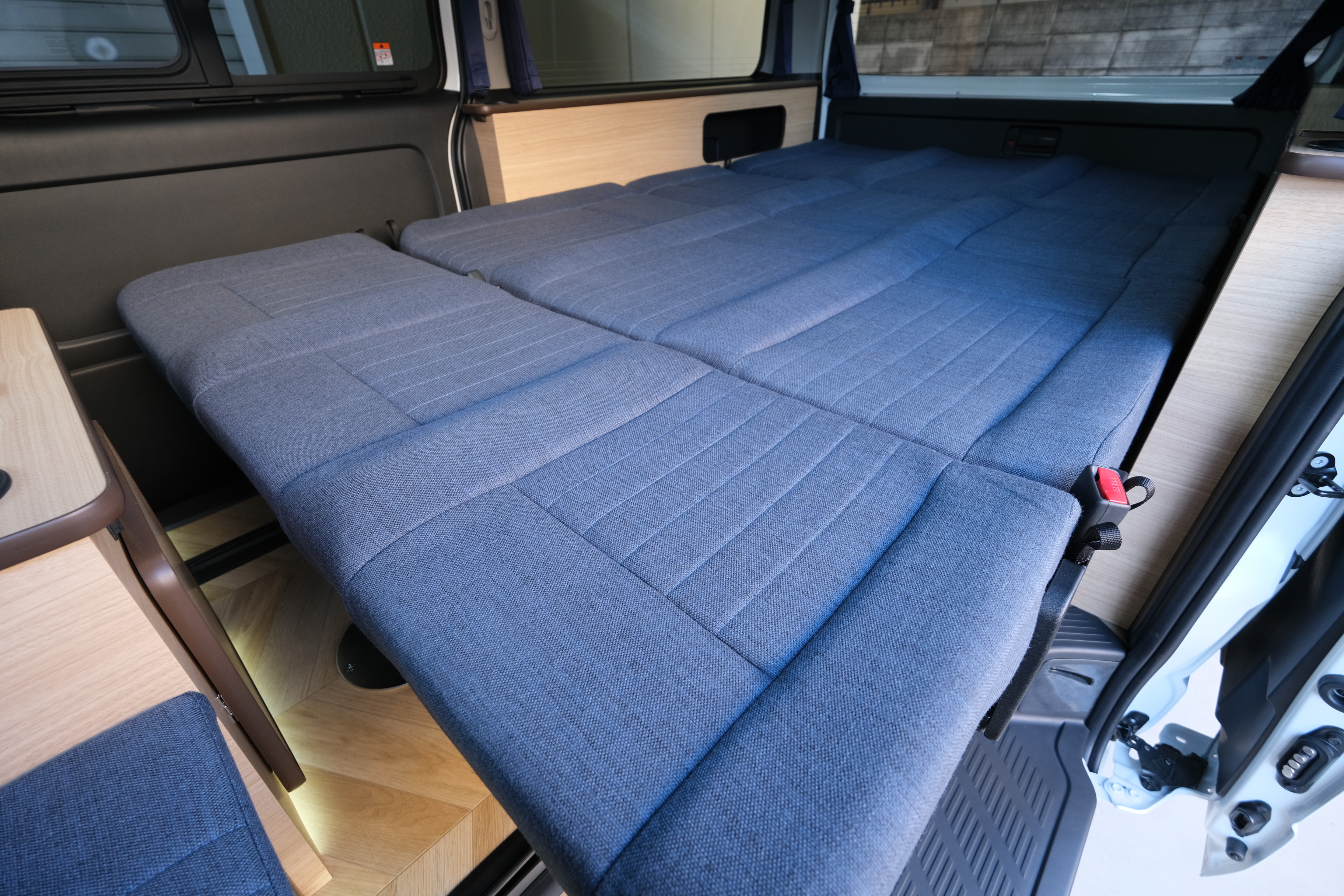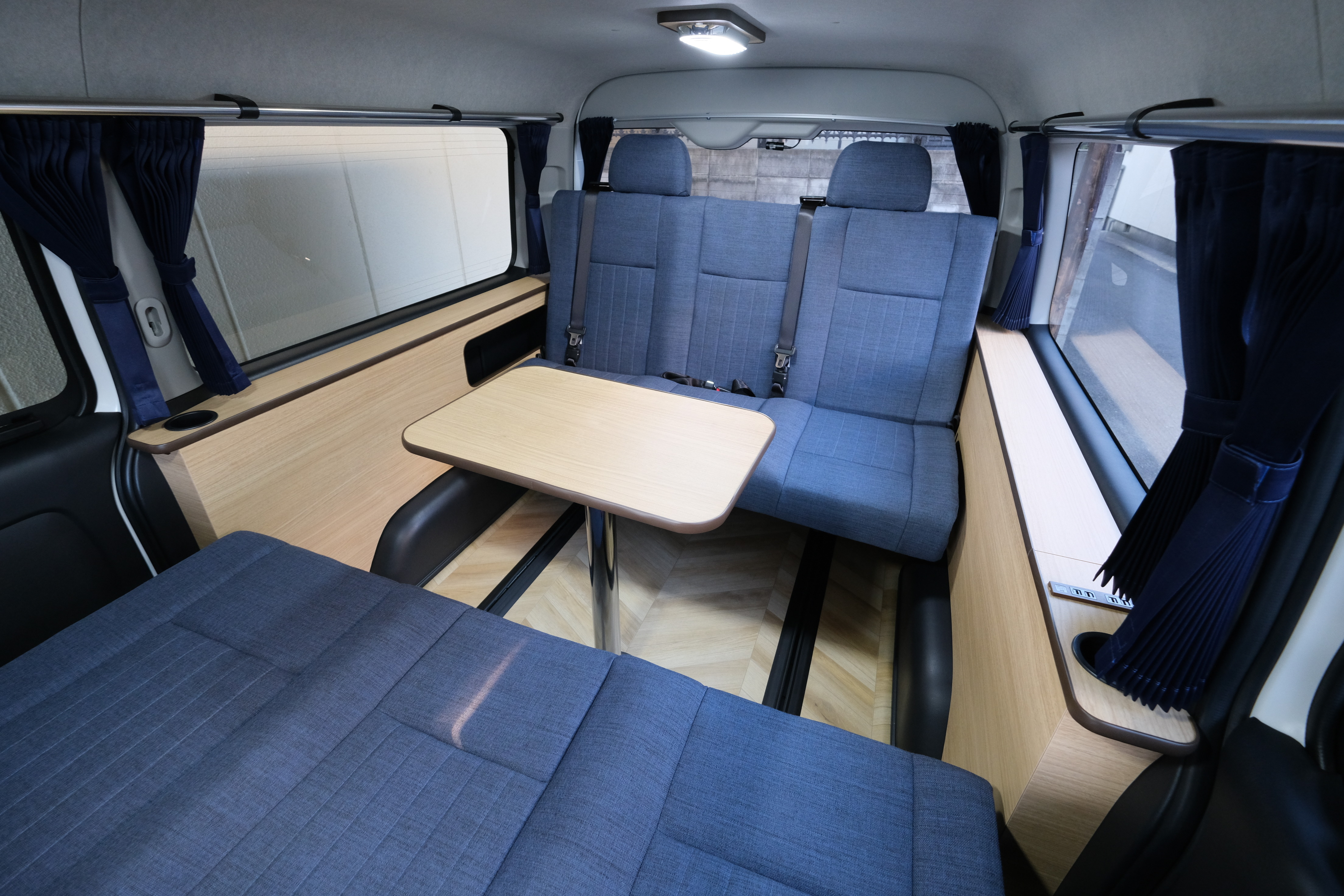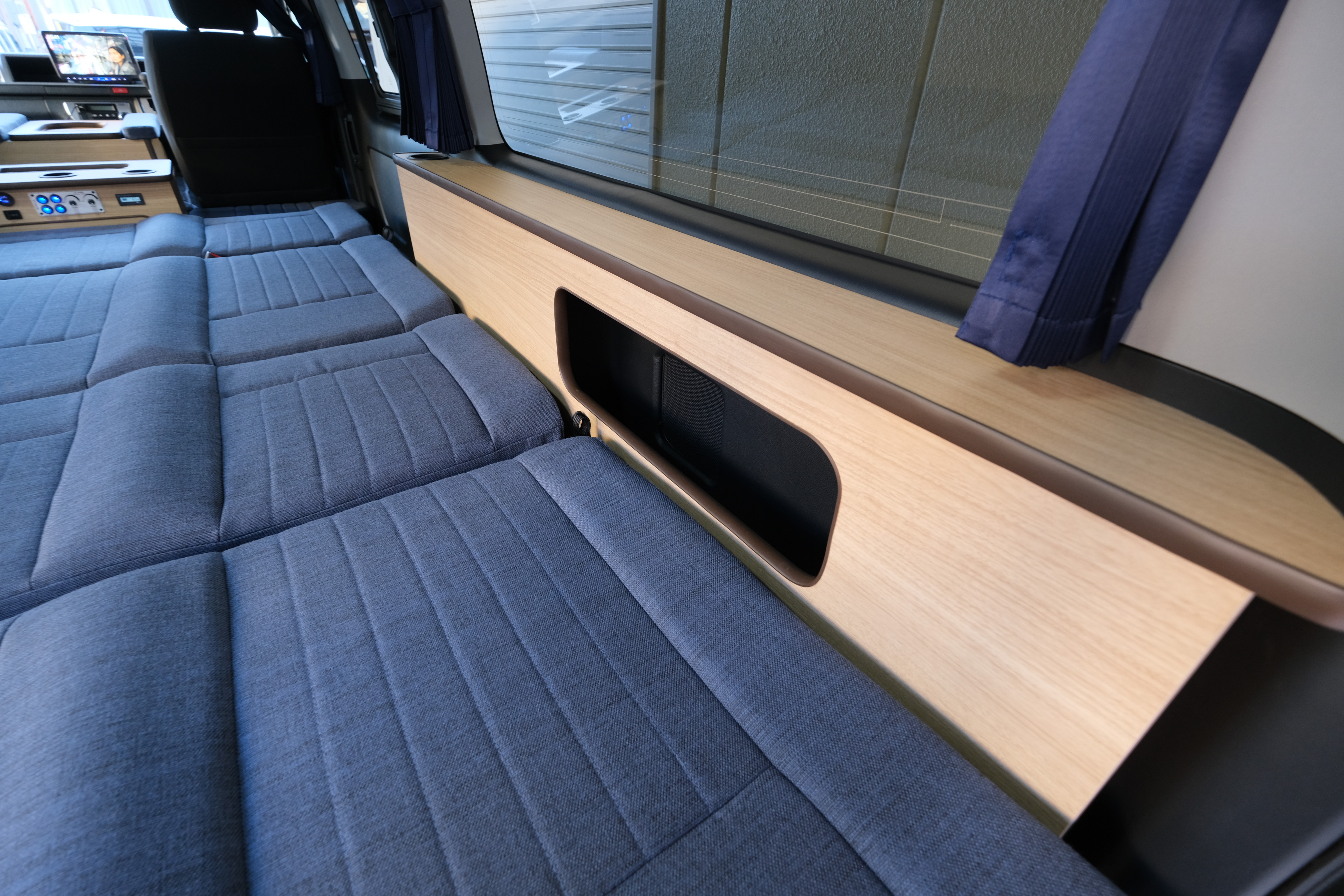 カーテンもオーダー色にて製作させて頂いており車中泊も楽々です